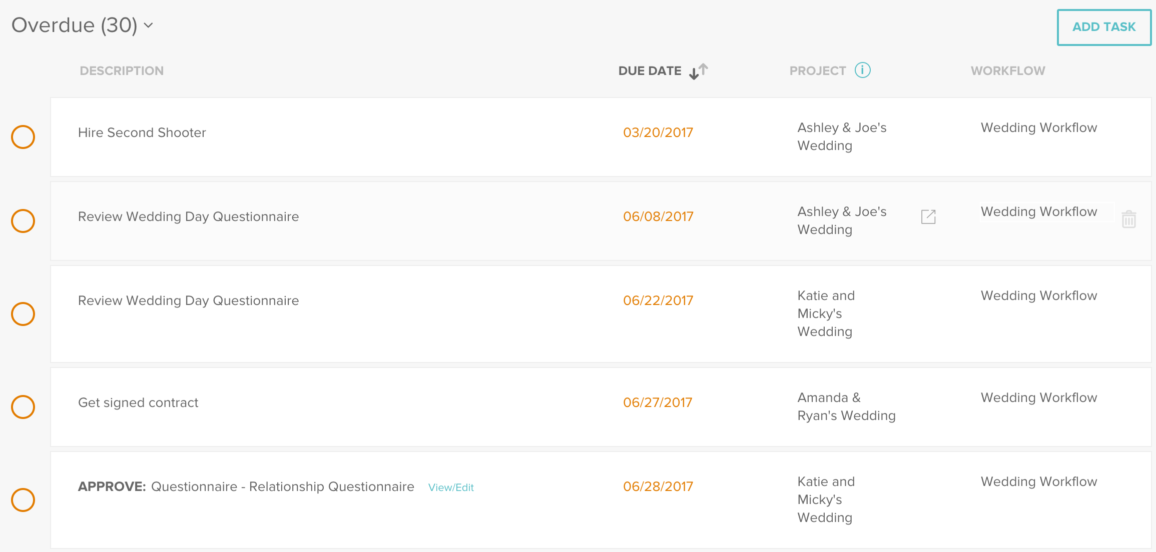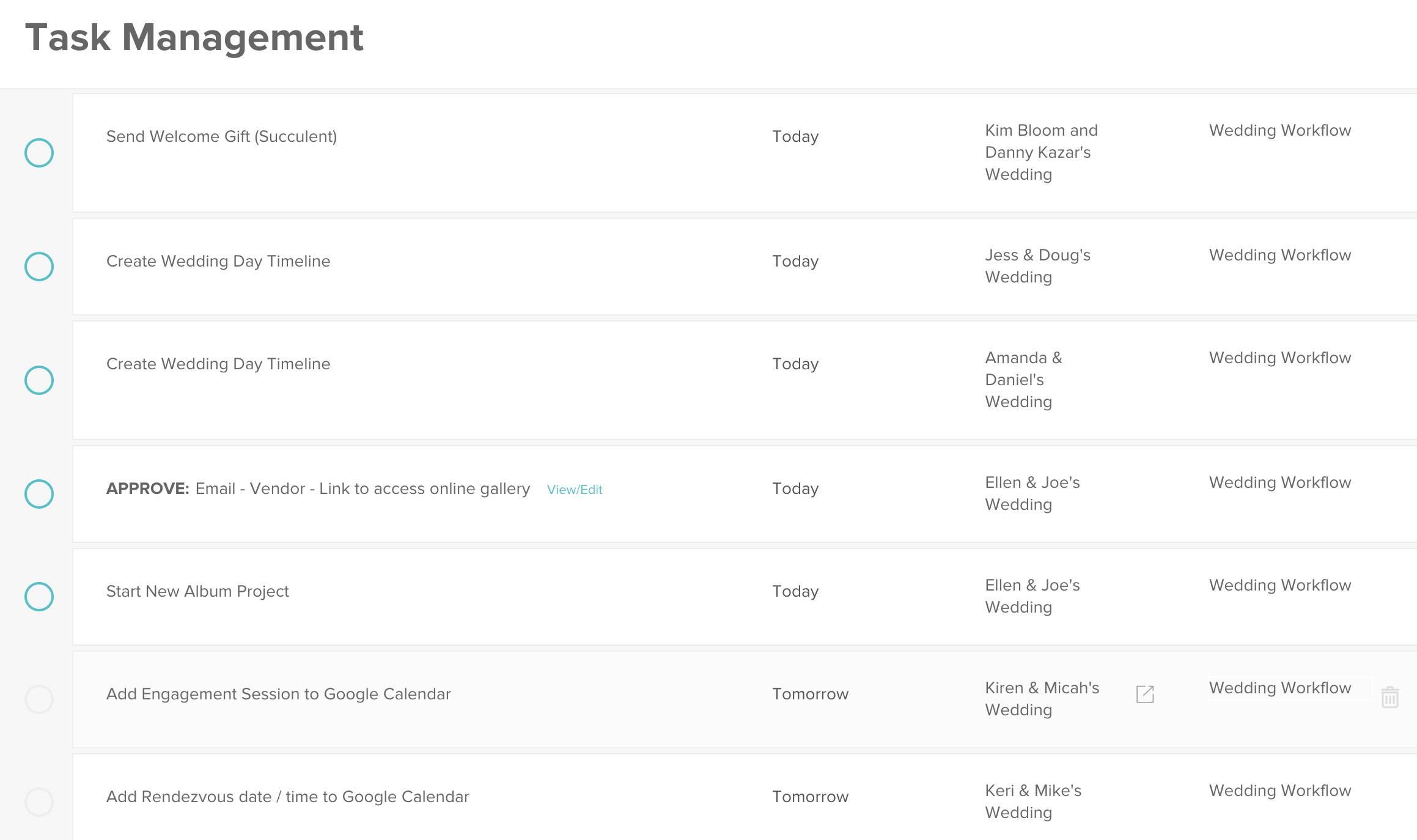 Within the workflow, I have step by step what needs to happen for every client and when. The way it works is you create templates, and create your tasks based on a trigger. (Think: 2 days after workflow is activated, or 5 days after previous step is complete, or 3 days before or after the project date, etc.)