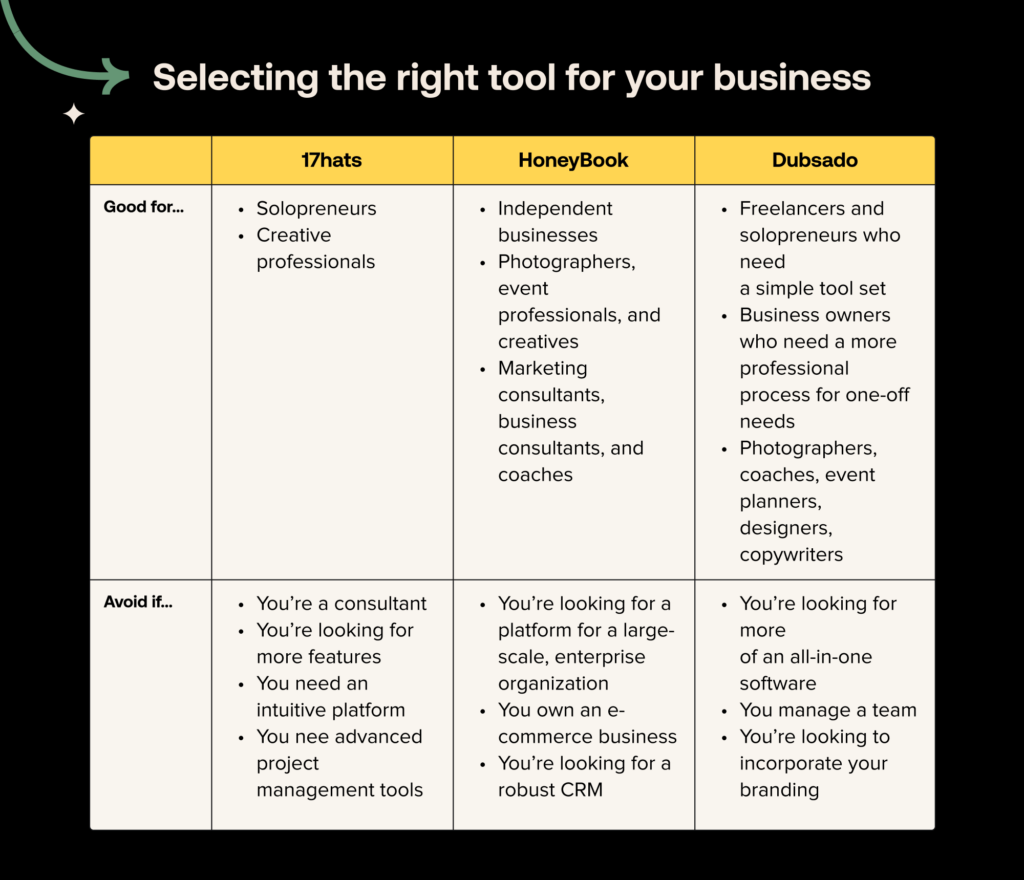 17hats, HoneyBook, and Dubsado each have different strong suits, though they offer a very similar set of tools. Ultimately I found that HoneyBook offered a bit more in most areas. However, the platform you choose will ultimately depend on your specific needs as well as what type of business you manage.