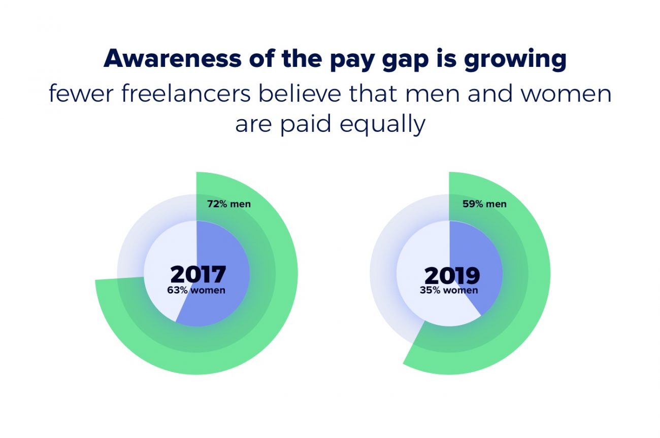The good news is that awareness of the gender pay gap is rising. In 2017, 63 percent of female and 72 percent of male freelancers believed that men and women earned equal pay. Today those percentages have shrunk. Only 35 percent of females and 59 percent of male freelancers believe that men and women earn equal pay.