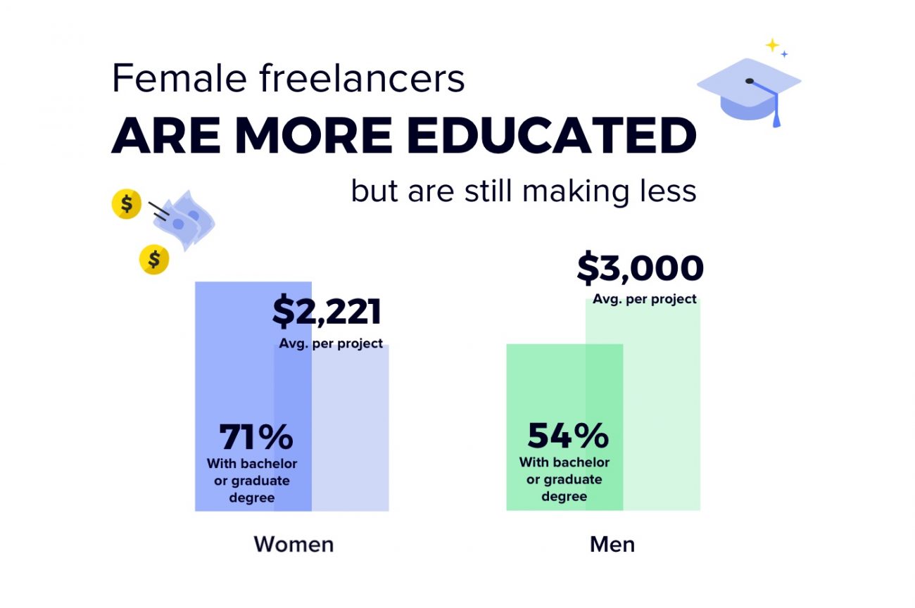 This stark gap exists despite the fact that female freelancers have obtained more education than their male counterparts. 71 percent of women have completed their bachelor or graduate degree, compared to 54 percent of men.