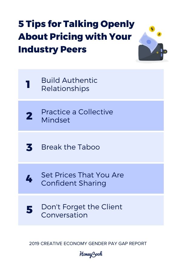 - Don’t skip the client conversation. Get comfortable talking about pricing and the value that your business brings with your clients. This is important for your business and will also make it easier to talk about money with your industry peers. Keina