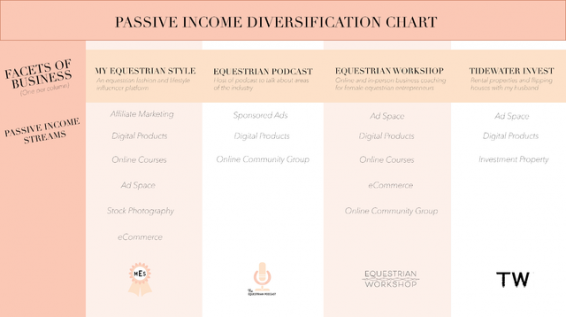 Outline what this looks like for you. How can you categorize your passive income? Diversification allows you to “divide and conquer” in a way where you can test out many methods and find what is the most successful for you and your brand. It also allows you to create passive income that pulls at all of those heart-strings within the passions of you and your community. Finally, something that may be selling like hotcakes one month might lay dormant the next. Diversifying your passive income streams allows you to maintain success within your business in different areas instead of having outside factors that are out of your control dictate your revenue.