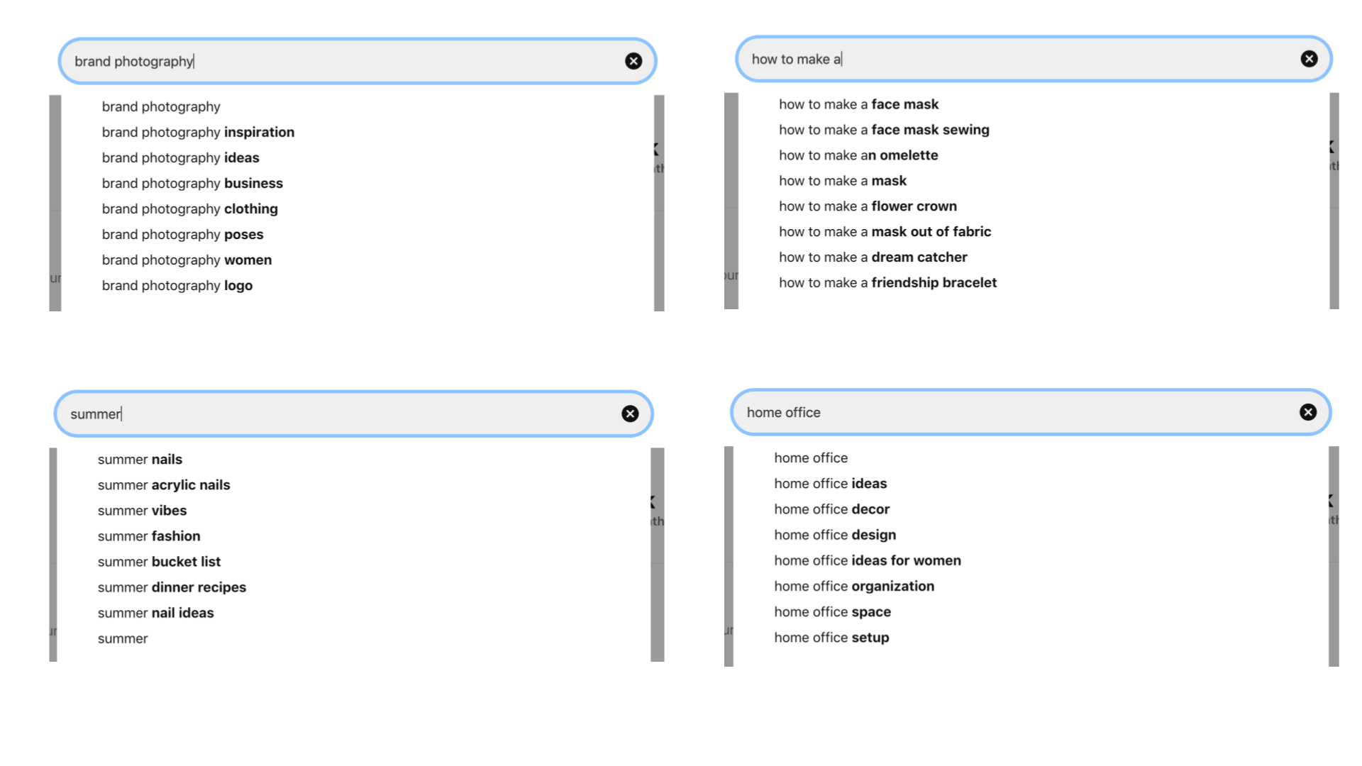 So how do you use Pinterest as a tool to find SEO keywords? More specifically, long-tail keywords? It’s pretty simple. Type in the topic you want to start creating content on and watch Pinterest populate the long-tail keyword based on what people are searching for most right now.