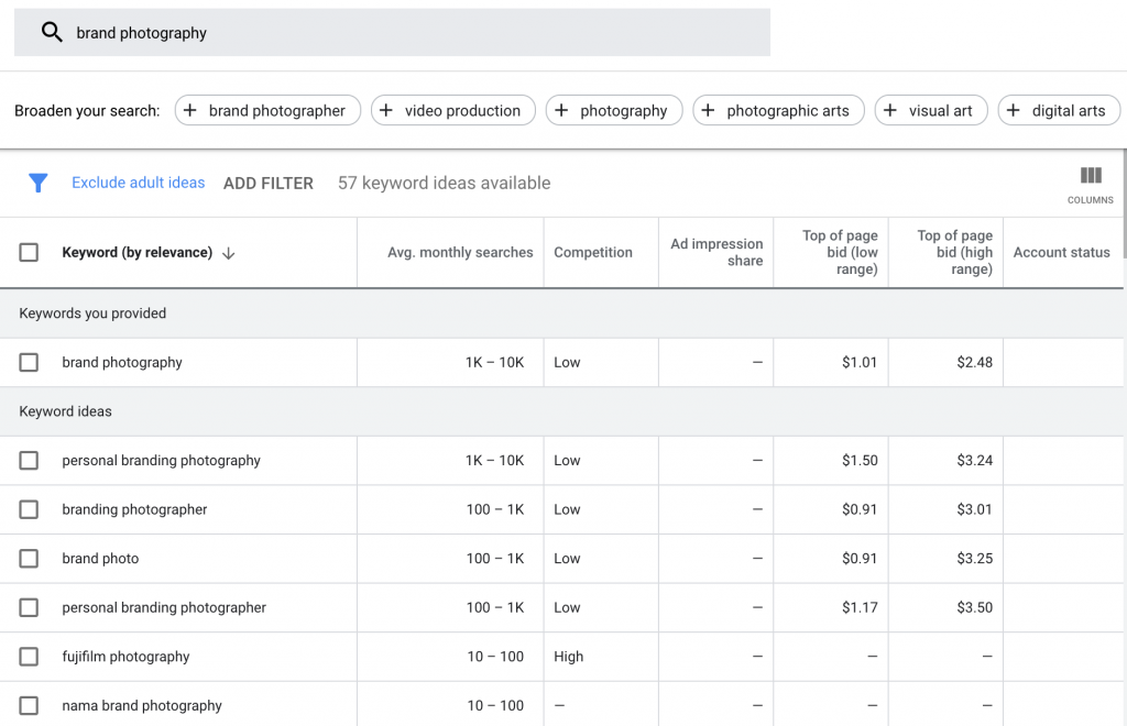 Google Keyword Planner tells us the keyword you selected is searched on average between 1k-10k times per month. Now, we understand this is a little vague. Unfortunately, this is all you get access to until you’ve run a campaign. After that, you are promised more insights. However, one of the reasons this is our favorite SEO keyword research tool is because it will automatically populate other keyword ideas like “personal branding photography.” Oftentimes we start here, ideate a few long-tail keywords and then head over to another tool (see more below!) to explore further.