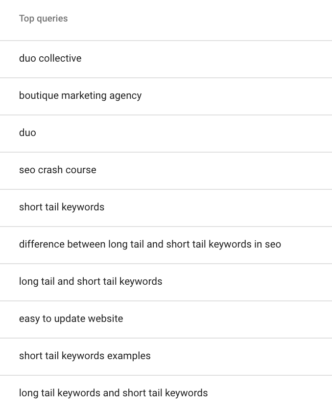 Having a good relationship with Google means maintaining your website to ensure your visitors have a happy experience. This resource will identify any errors such as missing links and 404 errors. But the main reason why we love this SEO tool is to understand exactly what keywords our audience is typing into Google to find us. Take a look at the screenshot below. These are all “queries” (keywords or search terms) that either generated clicks to our website from Google or appeared on the search engine page resulting in an impression. Pretty cool huh!?