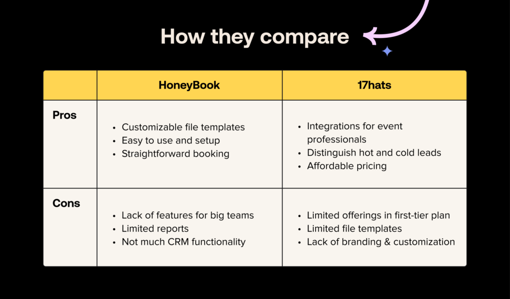 | Pros | – Highly customizable file templates for every step of your clientflow – Designed for ease of use and simple setup (file migration included) – Strong booking features for invoicing, contracts, and payments | – More integrations for event professionals – Ability to distinguish hot and cold leads – Affordable pricing for first-tier plan |