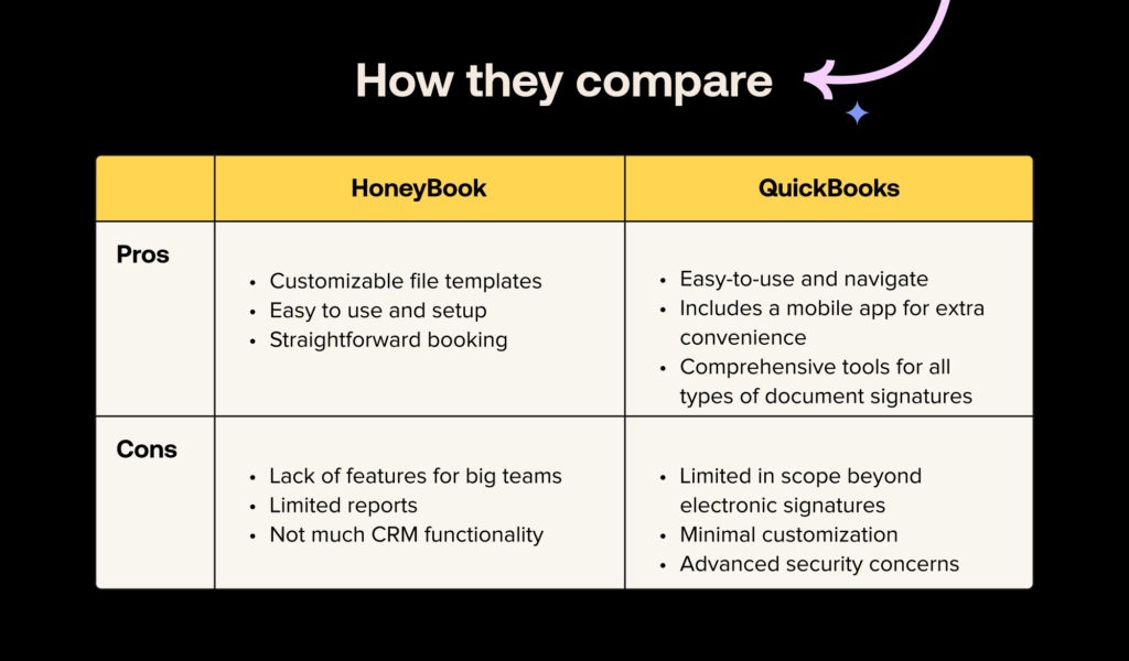 | – Unlimited clients and projects – Invoices and payments – Proposals and contracts – Calendar – All professional templates – Client portal – Basic reports | – Scheduler – Automations – QuickBooks Online integration – Up to 2 team members – Expense management – Profit and loss – Remove Powered by HoneyBook – Standard reports | – Unlimited team members – Priority support – Multiple companies – Onboarding specialist – Advanced reports |