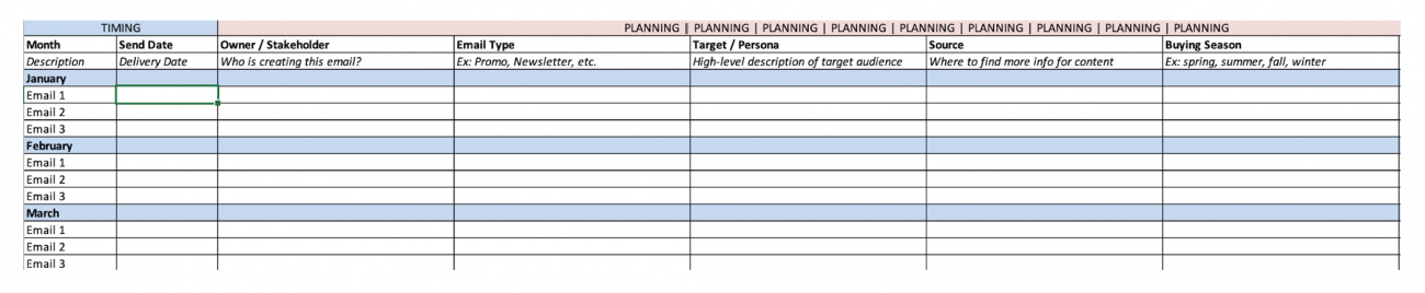 First, open up the email marketing strategy template here. Here’s what the planning calendar looks like: