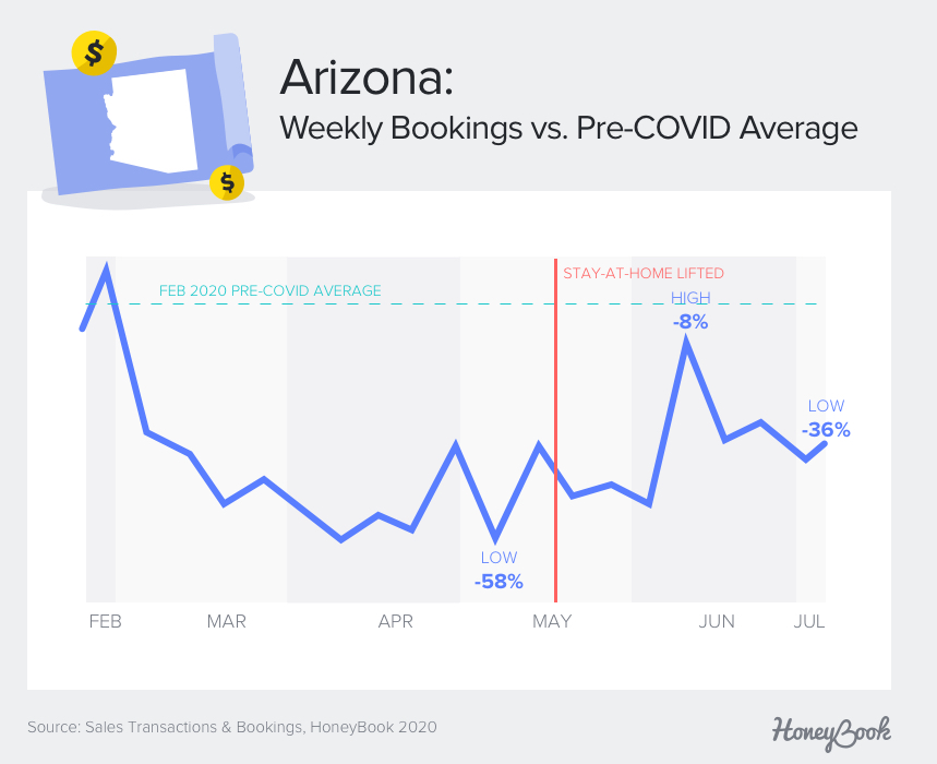 • In Arizona, bookings reached 92% of pre-COVID levels by the week of June 13 before dropping to 64% of pre-COVID levels by the second week of July, a 30% decrease.