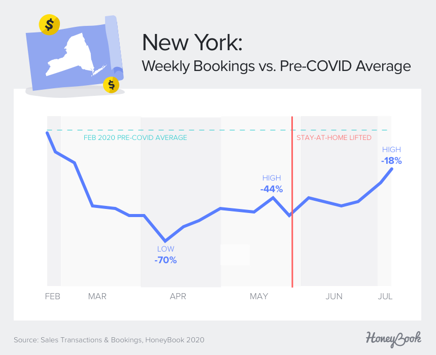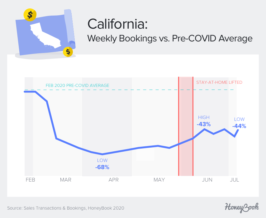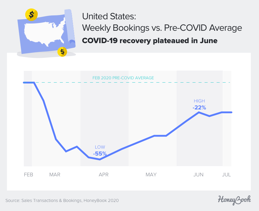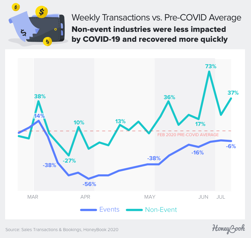 To find out, we took a look at aggregated, anonymous data from over 600,000 transactions and bookings on HoneyBook’s platform from February 1, 2020, to July 17, 2020. HoneyBook is the leading business management platform with over $2 billion in bookings, and our user base is a strong indicator of industry trends. In this report, we share what we’ve learned about the impact of COVID-19 on the freelance economy.