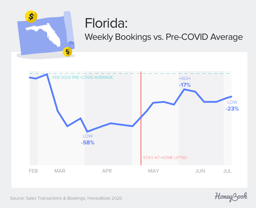 • In Florida, bookings reached 83% of pre-COVID levels by the week of June 6 before falling to 77% of pre-COVID levels by the second week of July, a 7% decrease.