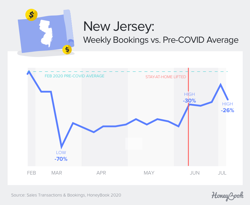 • In New Jersey, bookings reached 70% of pre-COVID levels by the week of June 13 before surpassing this high to reach 74% of pre-COVID levels by the second week of July, an increase of 6%.