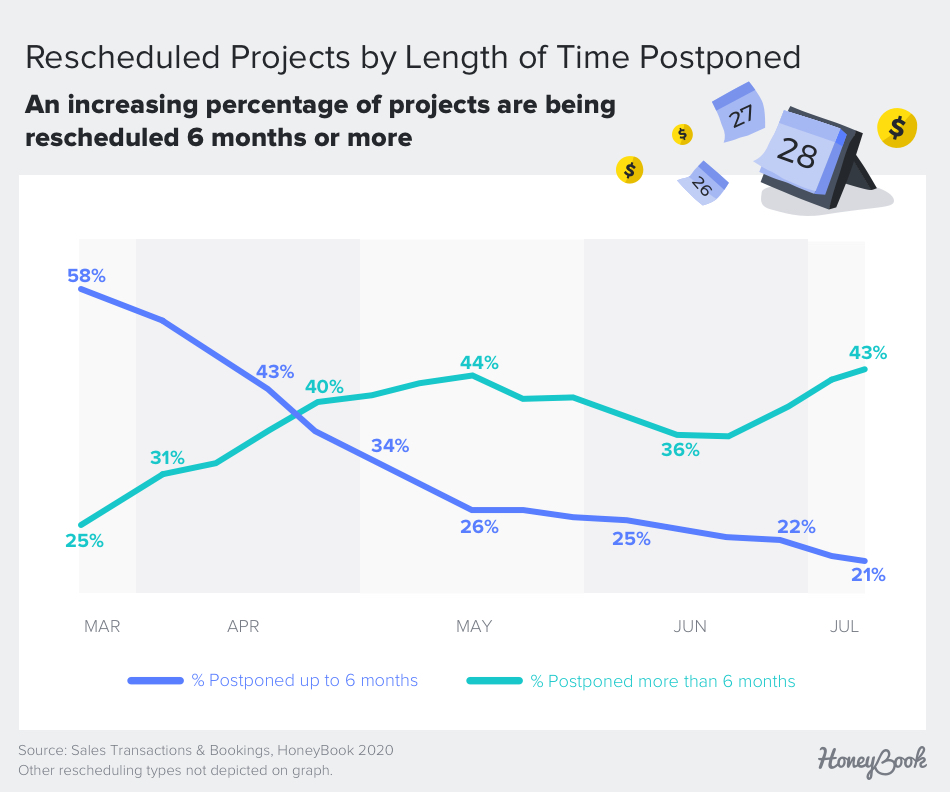 This shift in rescheduling behavior suggests a broader understanding by the general public of the time it may take for the country to recover fully from COVID-19. It appears that business owners and their clients are anticipating an extended recovery time and are therefore postponing their events for longer.
