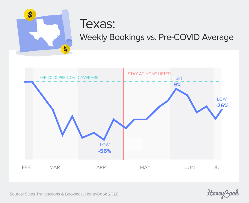 • In Texas, bookings reached 91% of pre-COVID levels by the week of June 6 before dropping to 74% of pre-COVID levels by the second week of July, a decrease of 18%.