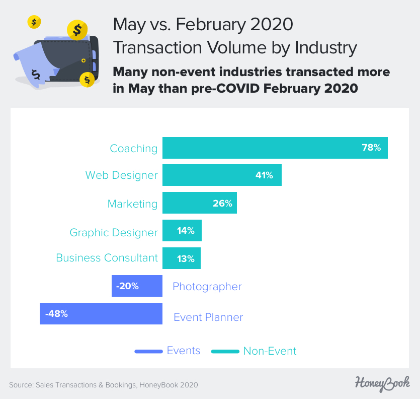 Non-event industries, which includes marketing professionals, interior designers, business coaches, and web and graphic designers, were also impacted initially but saw a less dramatic decline of 27% in transactions by the week of March 21. They also rebounded more quickly starting early April and have not been as severely affected since. By May 2020, non-event industries as a whole were transacting at February levels.