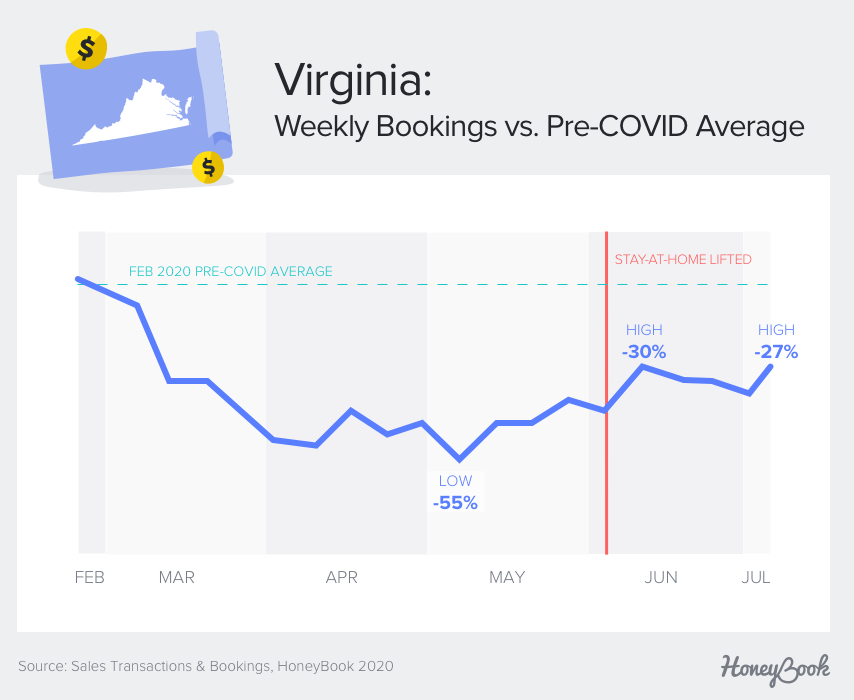 • In Virginia, bookings reached 70% of pre-COVID levels by the week of June 13 before surpassing this high to reach 73% of pre-COVID levels by the second week of July, a 4% increase.