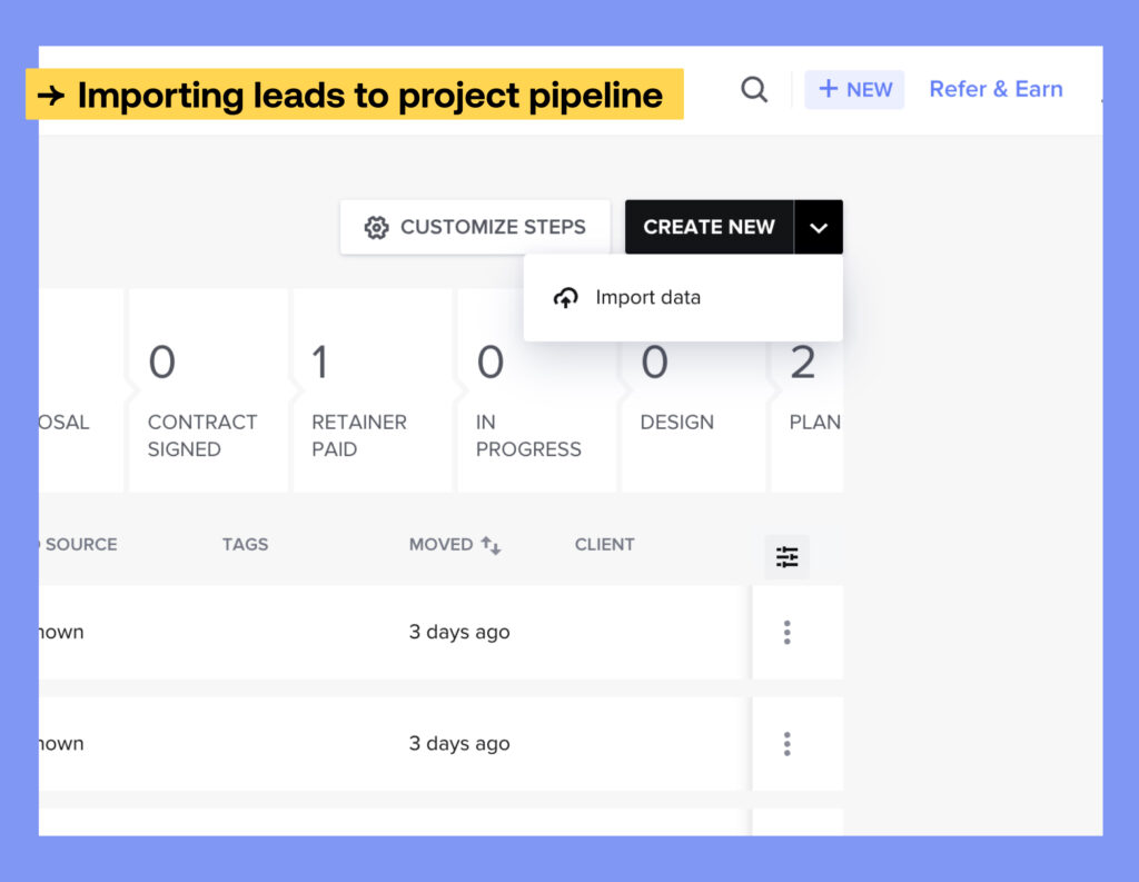 Easily import leads and contacts into HoneyBook