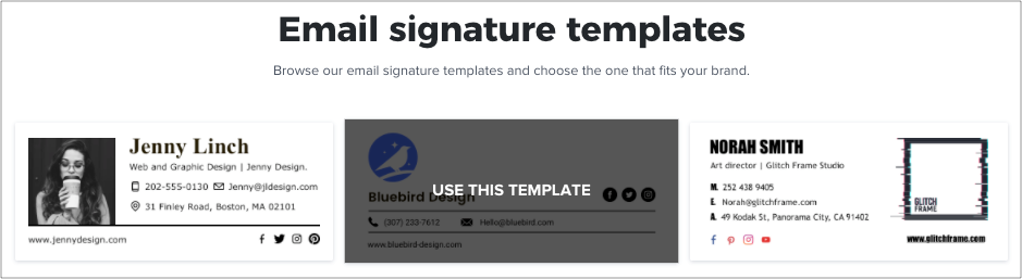 Choose an email signature template that’s most aligned to your branding. Also consider the latest trends in email signatures and which styles would look best for you. Don’t forget to consider font style (we include both serif and sans-serif options), how front and center you’d like your logo or headshot to be, and the types of social icons that are included. To select your template, simply hover over it and click “Use this template.”