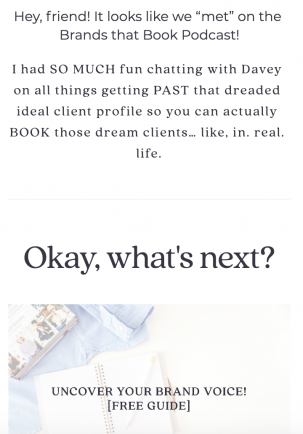 If you have a poppin’ podcast feature or a BOMB blog post that sends you daily traffic, make sure you have a lead magnet upgrade on that sucker! If you’re sending podcast or online summit listeners to a resource, make sure you have a specific page that’s easy for them to navigate to, or a page with a URL solely devoted to that audience.