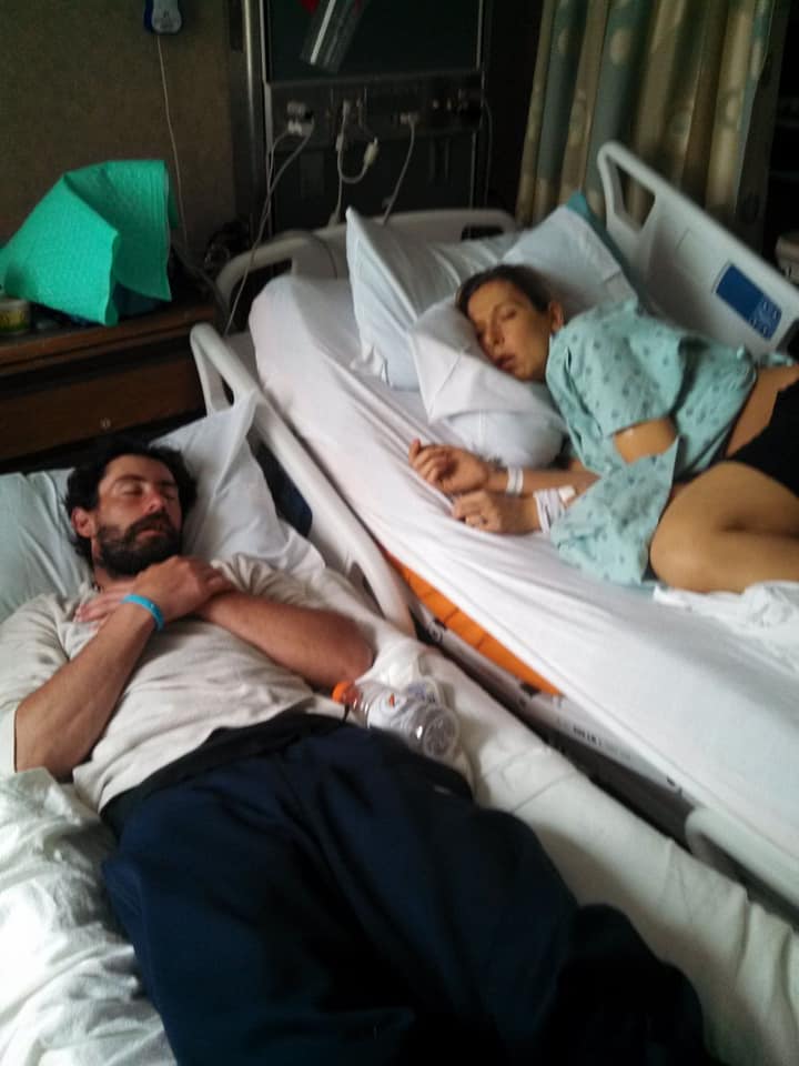 A man sleeping in a cot, next to a hospital bed, where his fiancé of 6 years was lying, recovering from her 3rd liver transplant.